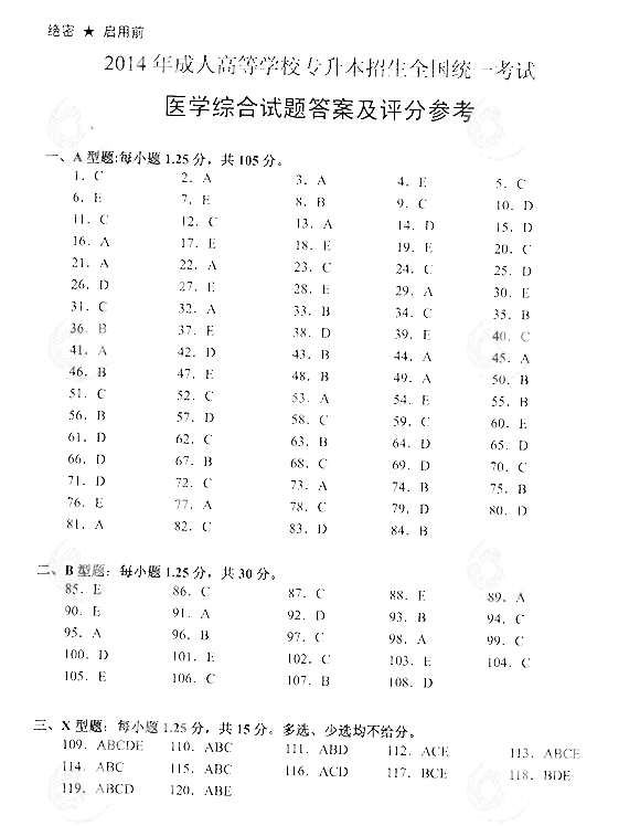 2014年成人高考专升本《医学综合》真题及答案