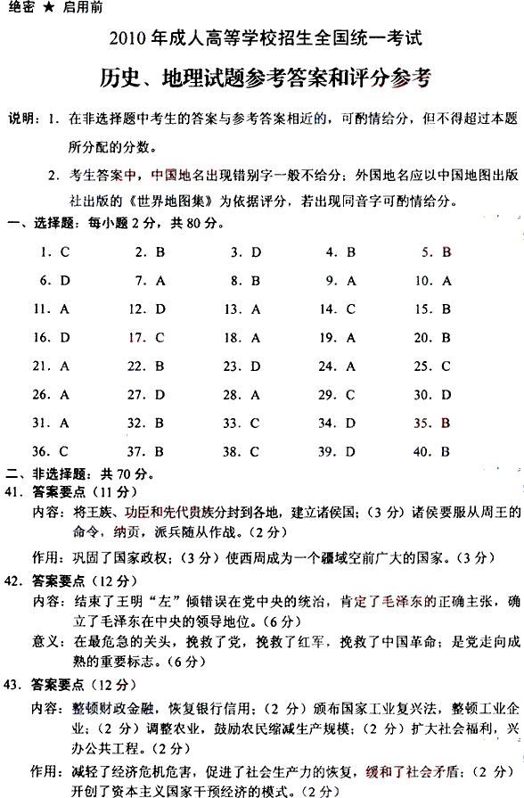 2010年全国成人高考高起点《历史地理》试题及答案